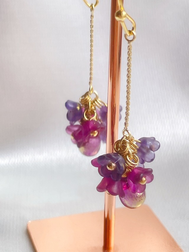 まるで熟した葡萄のような色合いを持つお花のピアスです。深みのあるカラーが、あなたの耳元を華やかに演出します。 お花の柔らかなデザインが優しい雰囲気を醸し出し、お着物や浴衣にもドレッシーな装いにもぴったりです。特別な日にはもちろん、日常使いにもおすすめのアイテムです。 金具にはニッケルフリーを採用しており、敏感肌の方にも安心してお使いいただけます。 心を込めて一つ一つ丁寧にお作りしました。 あなたの日常に華を添えるこの特別なアイテムを、ぜひ取り入れてみてください!