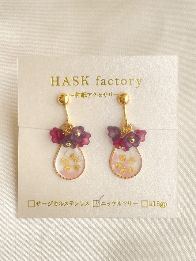 透け感のある桜柄の和紙を使用したドロップ型のデザインで、耳元に華やかさを添えるイヤリングとなっています! 濃淡のある紫色の小花が美しく、やさしく揺れる様子は、さりげなくも存在感を放ちます。 和紙の独特なテクスチャーが上品な雰囲気を演出し、普段使いはもちろん特別な日にもぴったりです。 金具はニッケルフリー