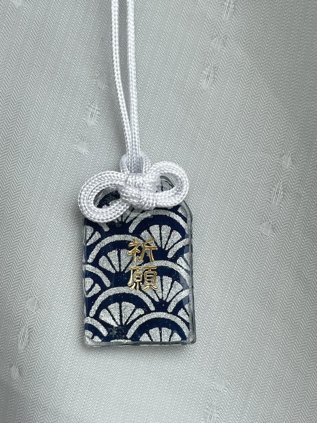 ■お守り ハンドメイド 青海波 ネイビー 青海波柄の和紙を閉じ込めたお守りは、あなたの日常に穏やかなパワーをもたらしてくれます! 青海波は波の連なりを象徴し、持つ人に深い安定感を与えます。 『未来永劫に平穏な生活が続くように』という意味が込められています。 裏面には美しい桜柄が施され、春の訪れを感じるような優雅さが魅力的です。 和紙の独特な質感が温もりを感じさせ、手にしっくりと馴染むサイズ感です。 心の安定や癒しを求める方、ご自身へのご褒美や大切な人への贈り物にも最適です!ハンドメイドの温かさをぜひ体感してください。