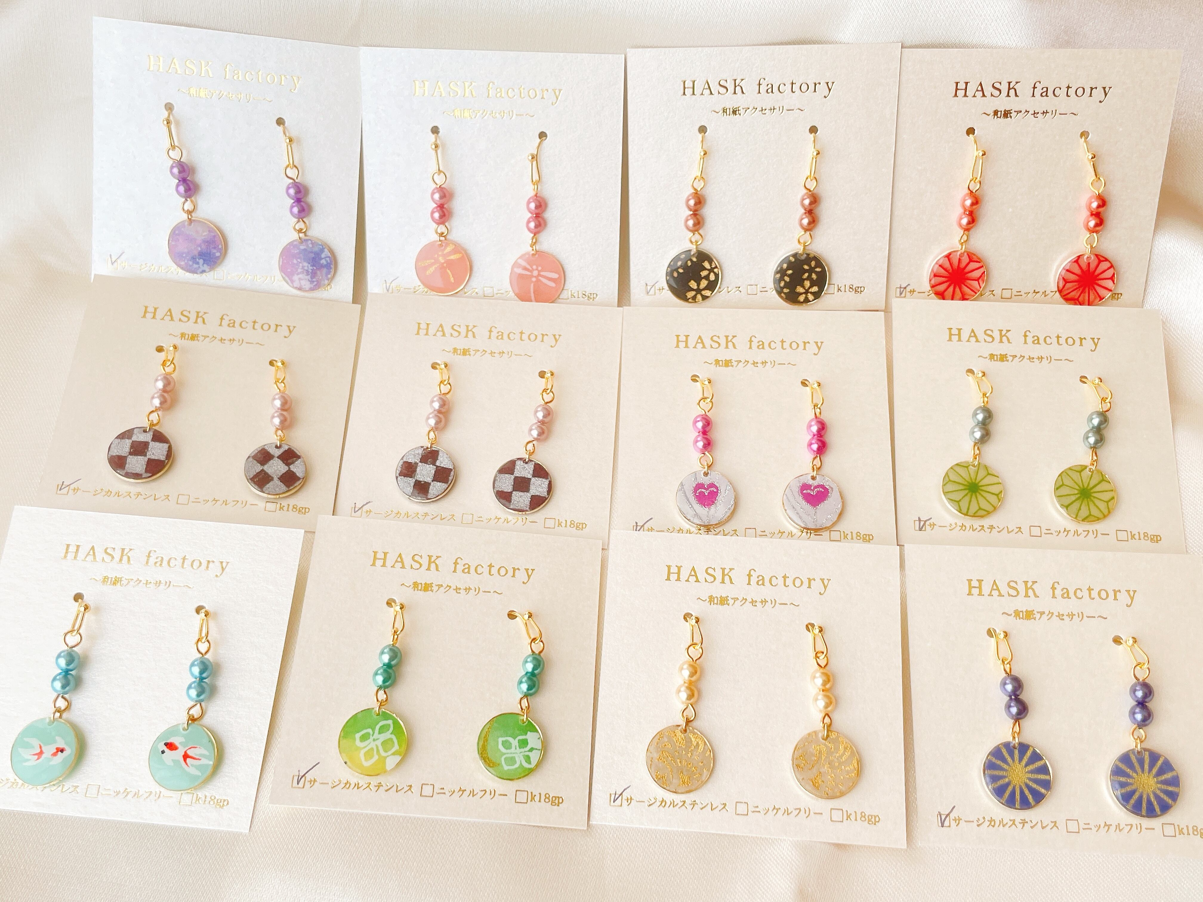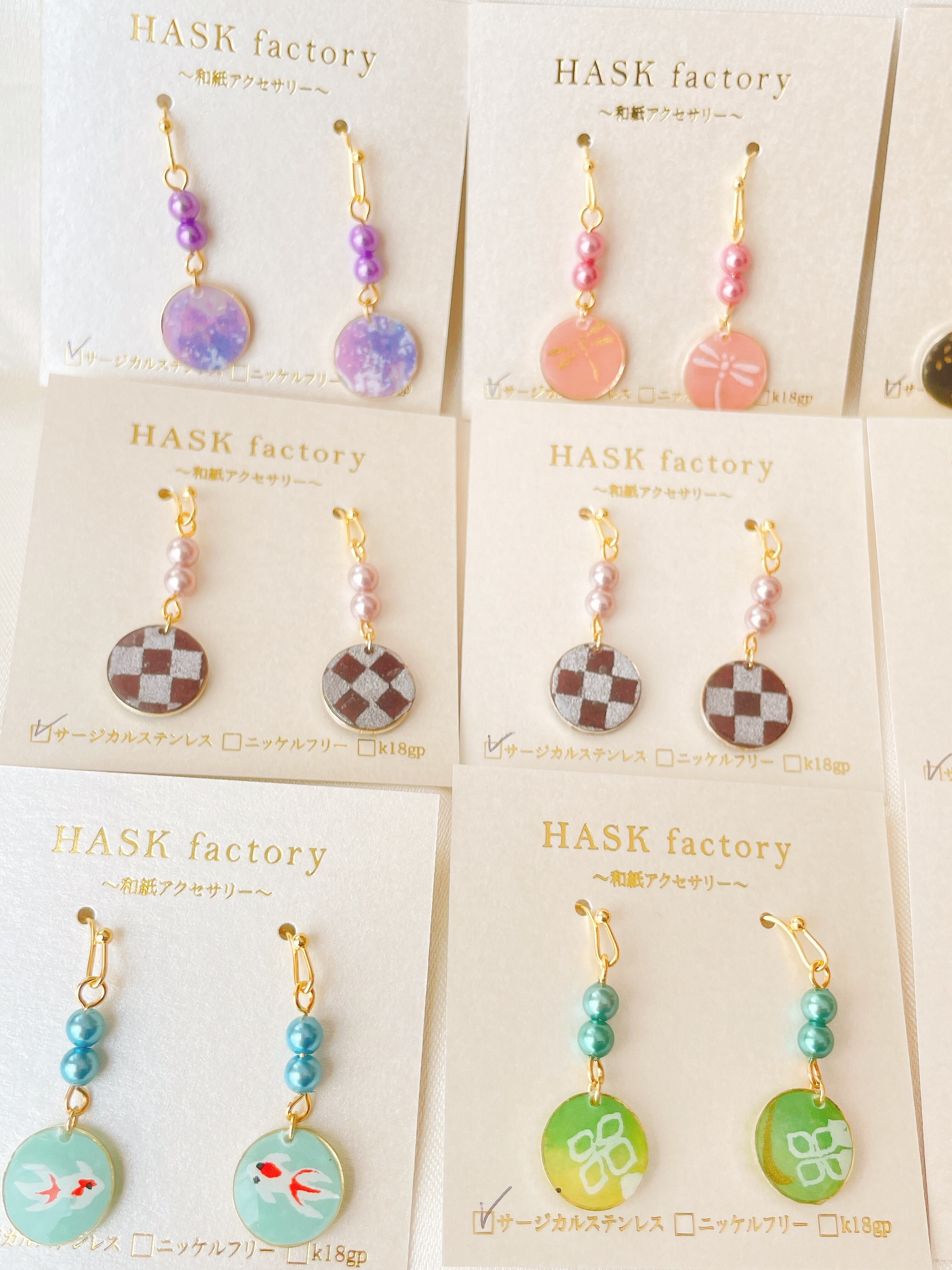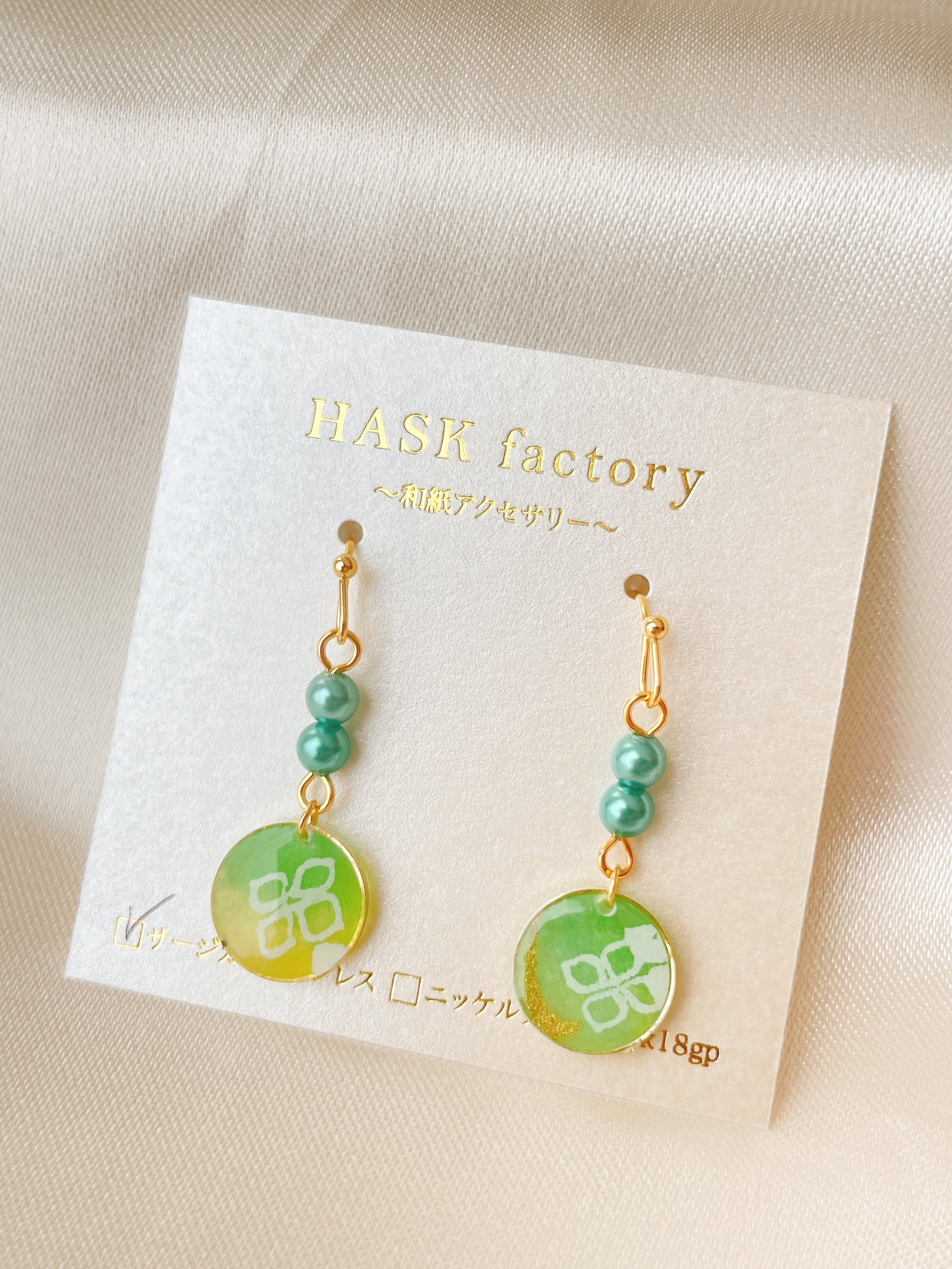 美しいエメラルドグリーン色に手染めされた国産パールと和紙がコラボレーションしたピアスです。