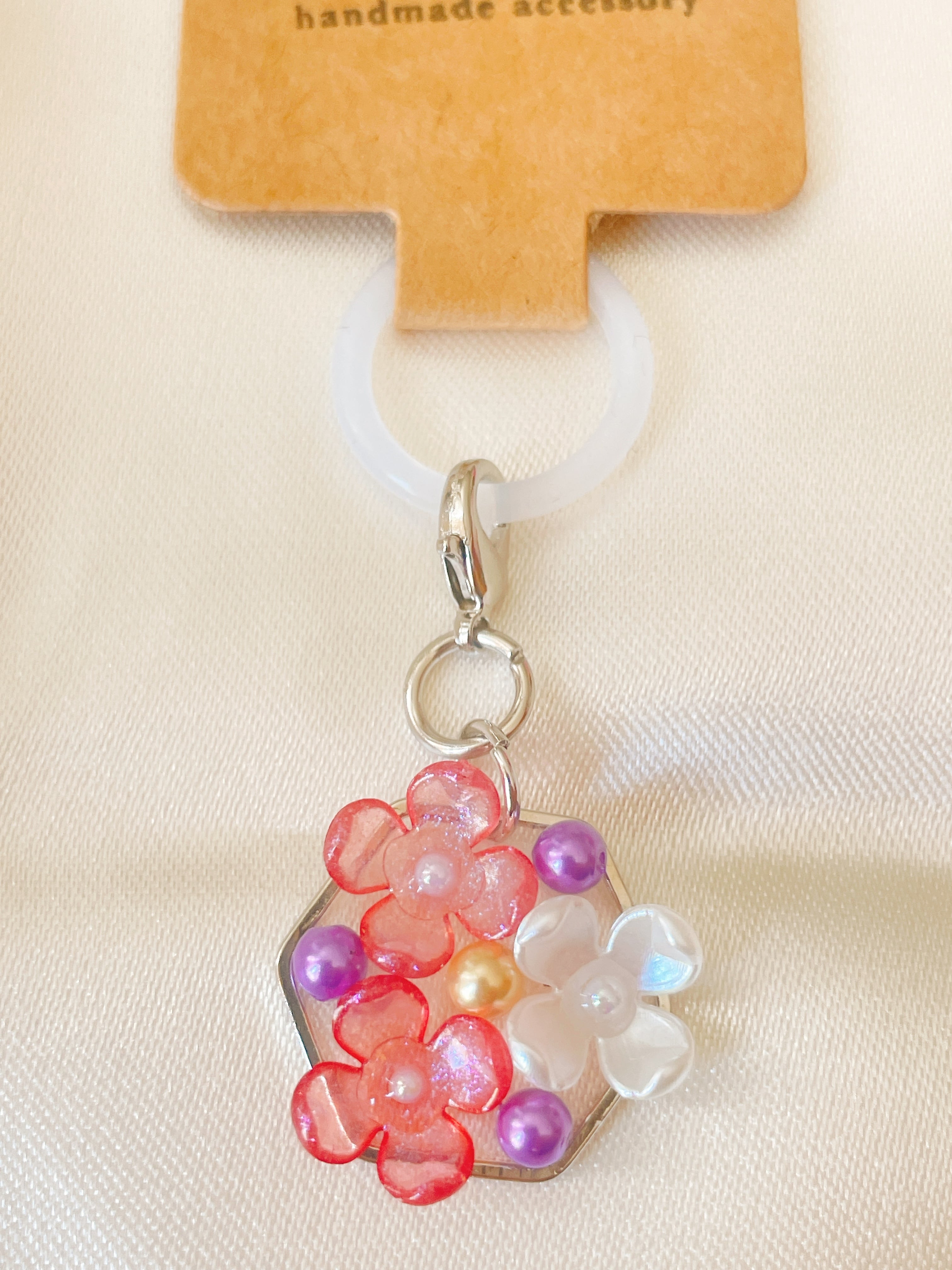 めじるしチャーム 手染め国産パールとフラワー ビビッドピンク×ホワイト