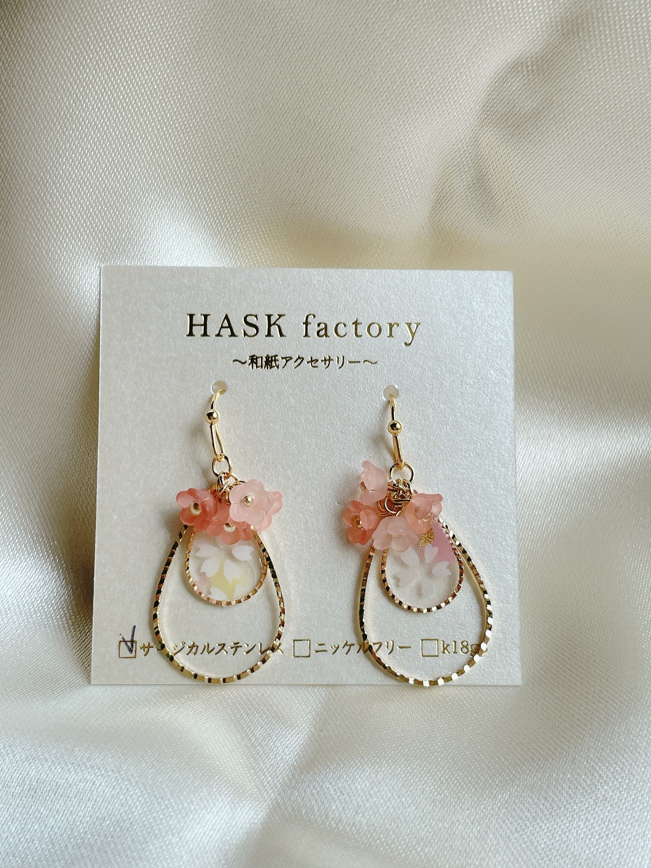 透け感のある桜柄の和紙を使用したドロップ型のデザインで、耳元に華やかさを添える一品となっています!