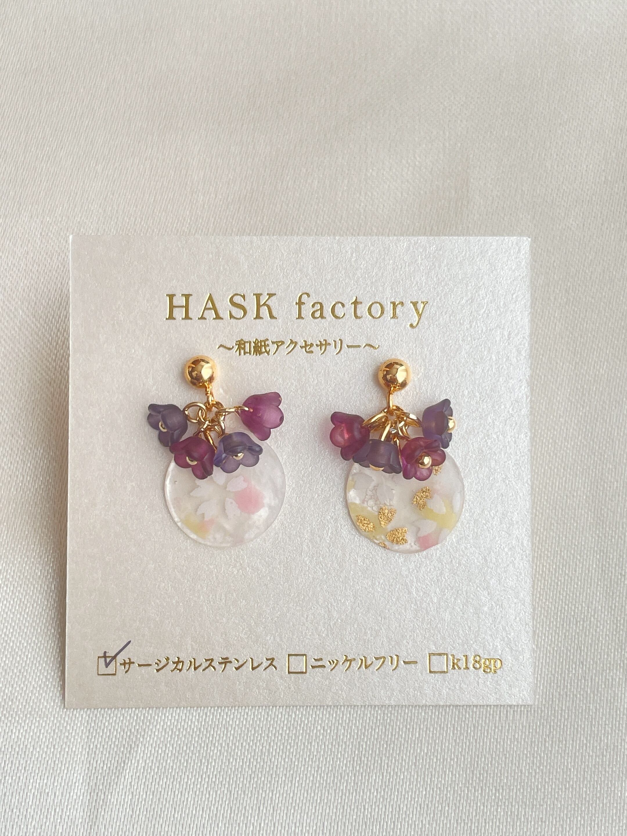 サークル型のシェルに、透け感のある桜柄の和紙を使用したデザインで、耳元に華やかさを添える一品となっています!