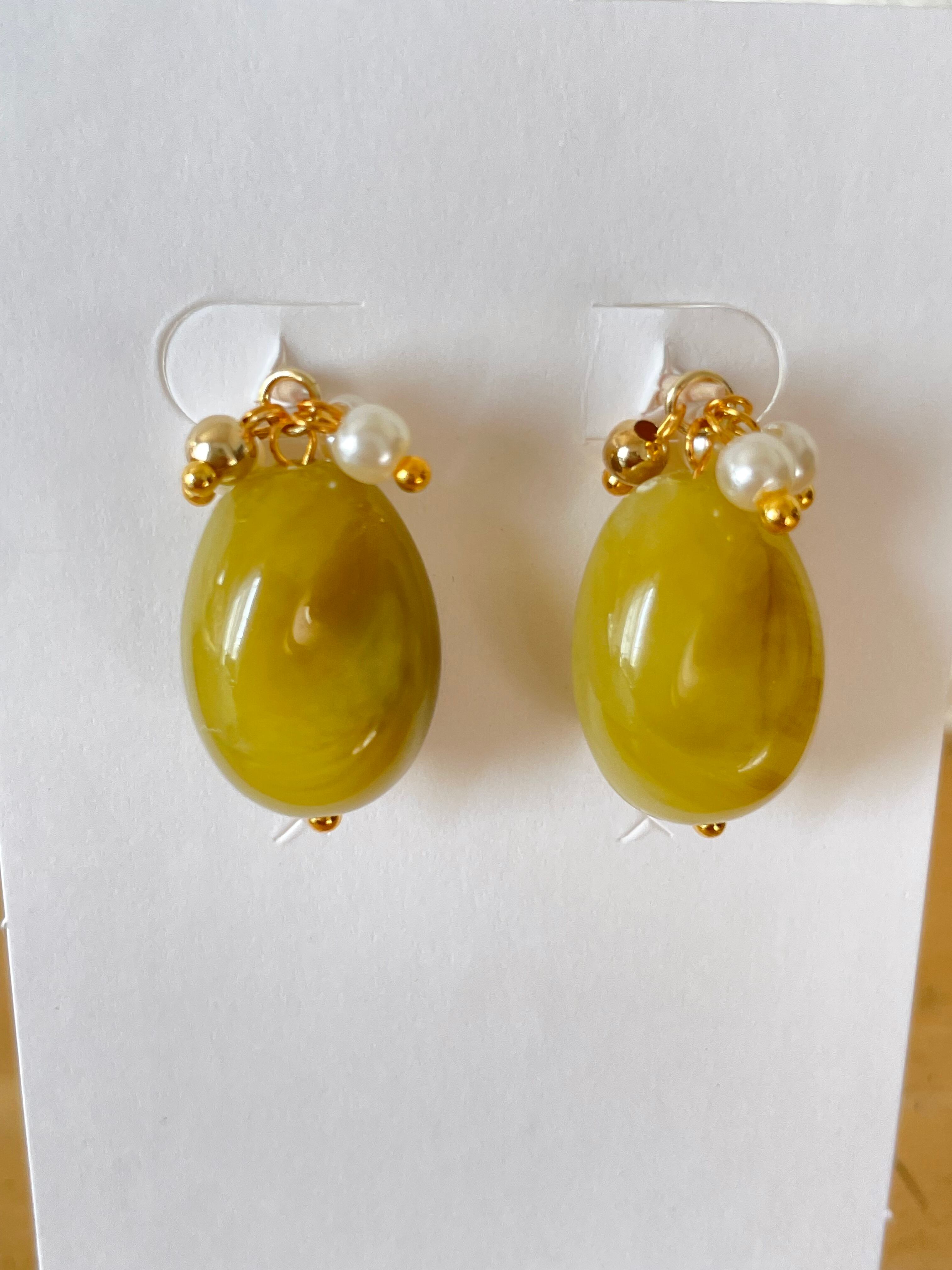 まるでソラマメのような形で、ピスタチオのような色味のピアスです。