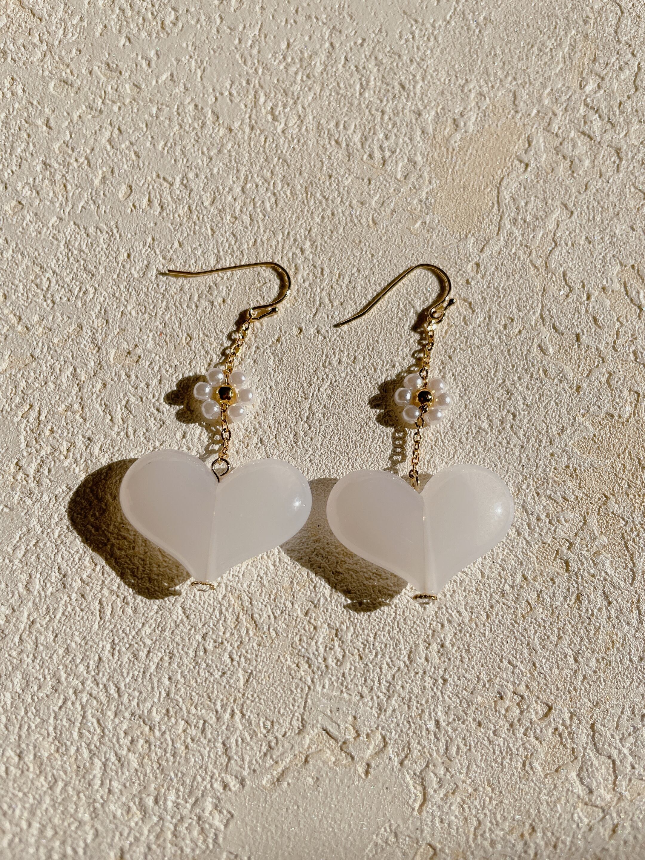春の訪れを感じるピアス「もうすぐ春ですねピアス」。真っ白なハートと小花が揺れるデザインは、さりげなく女性らしさを演出します。特別な日にも、普段使いにもぴったりなアイテムです。