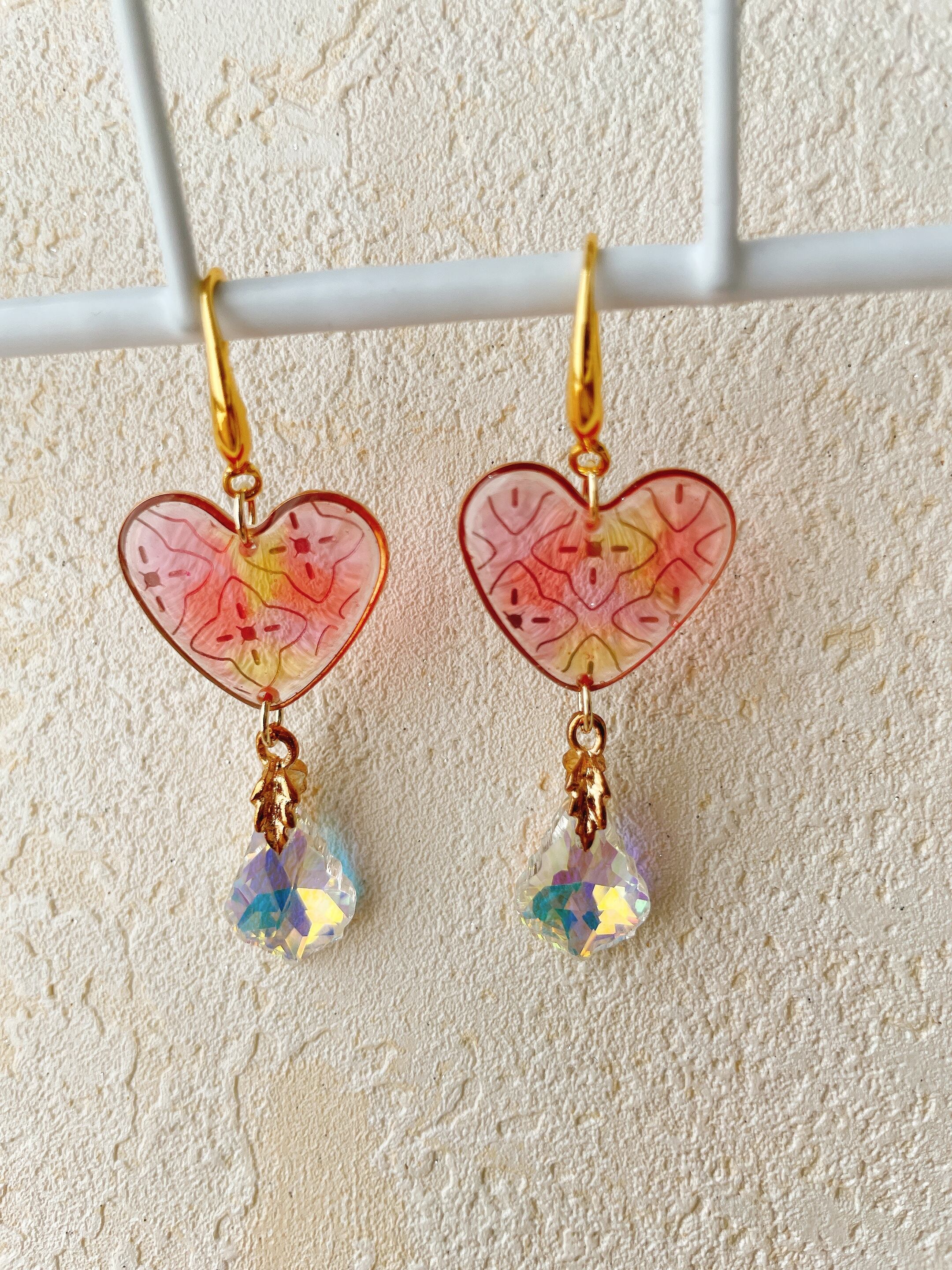 ハートのキラキラピアスは、和紙で色付けされたハートと、輝くチャームが揺れる可愛らしいデザインが魅力です。
