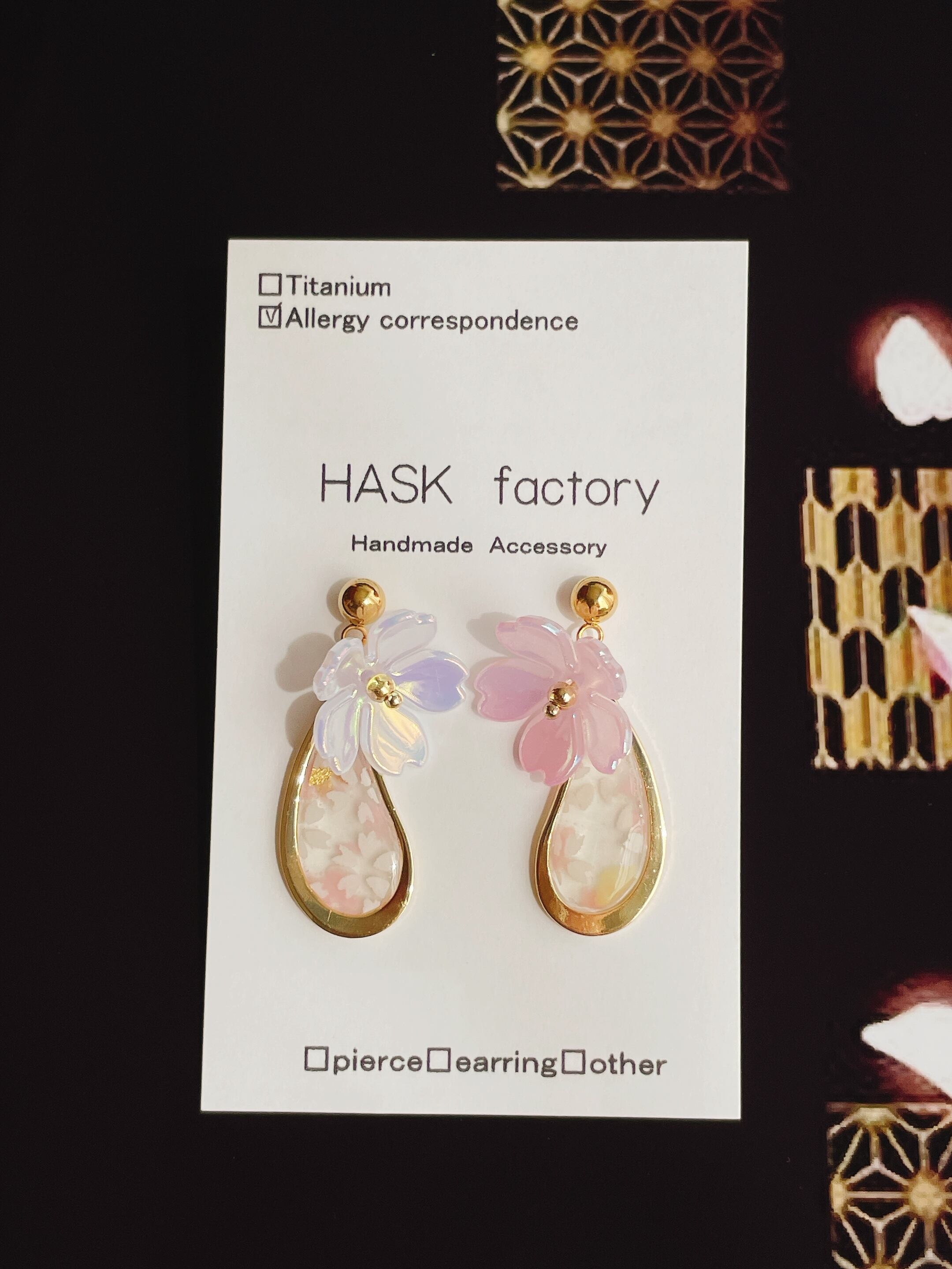桜のピアスは、優雅な桜の花が一輪付いた、桜模様のドロップ型ピアスです。