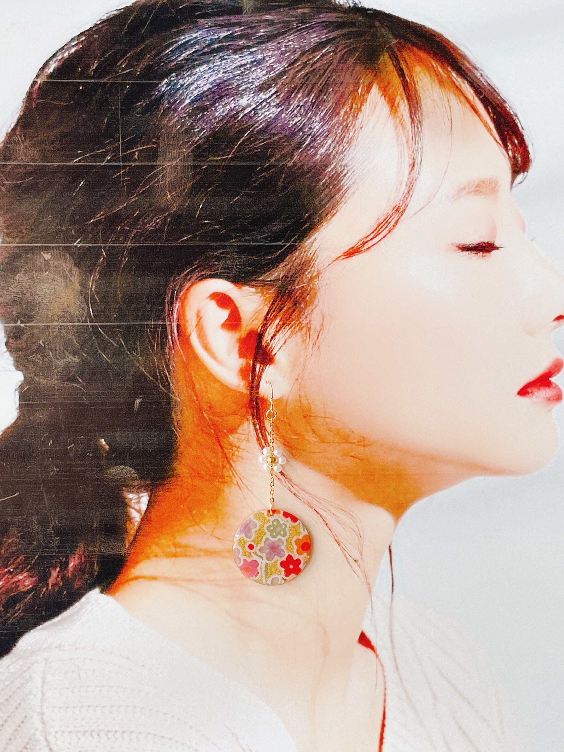 和纸圈耳环的特征是背面设计不同,独特的设计。乍一看是简单的设计,但是转过身就能看到漂亮的和纸图案的装置是关键。因为左右耳环的设计各不相同,所以是可以展现出随意时尚的单品。