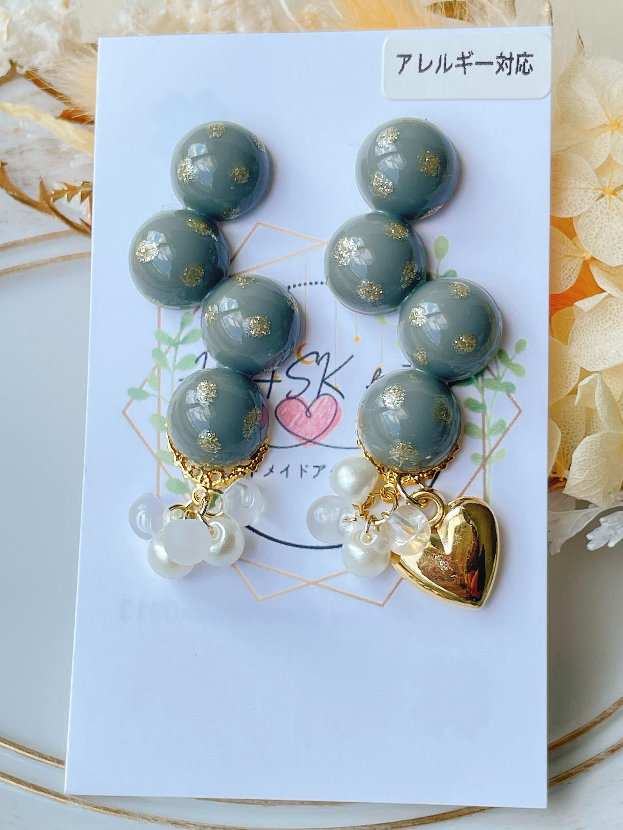 4連ピアス グレードットは、上品なデザインと高品質な素材が融合したアクセサリーです。金のドット柄が華やかさを演出し、グレーのカボションがシックな印象を与えます。金具には肌に優しい樹脂を使用しており、安心して長時間身に着けることができます。