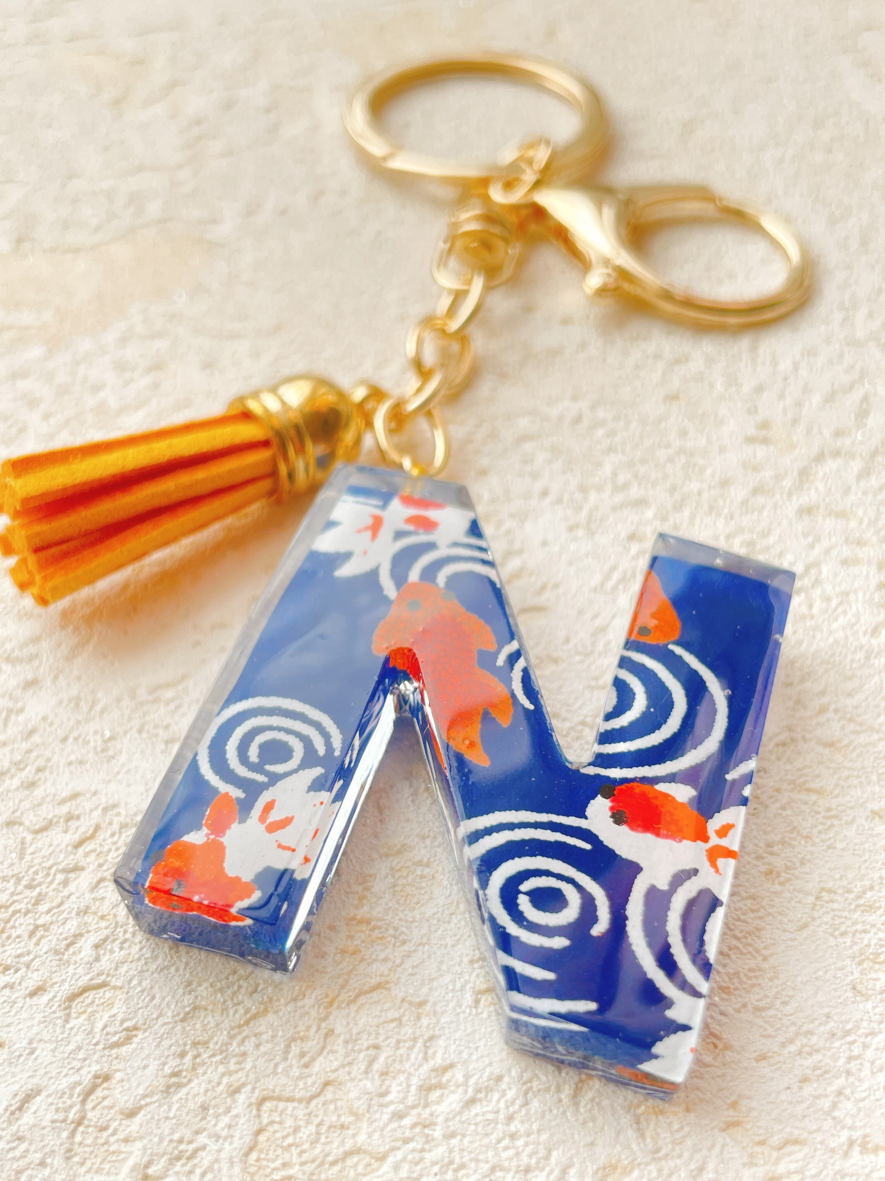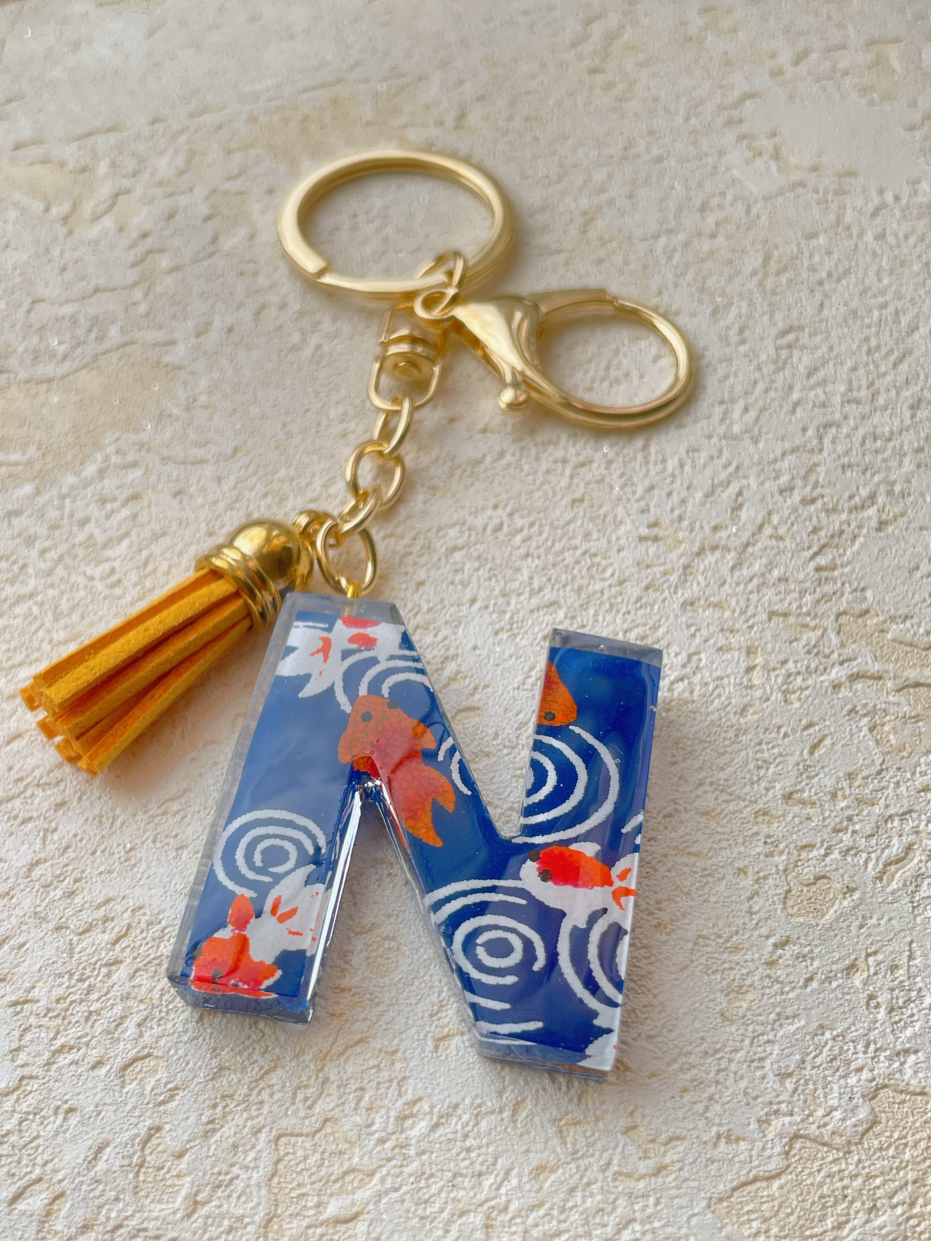 金魚柄の和紙を使用したイニシャルキーホルダーです。