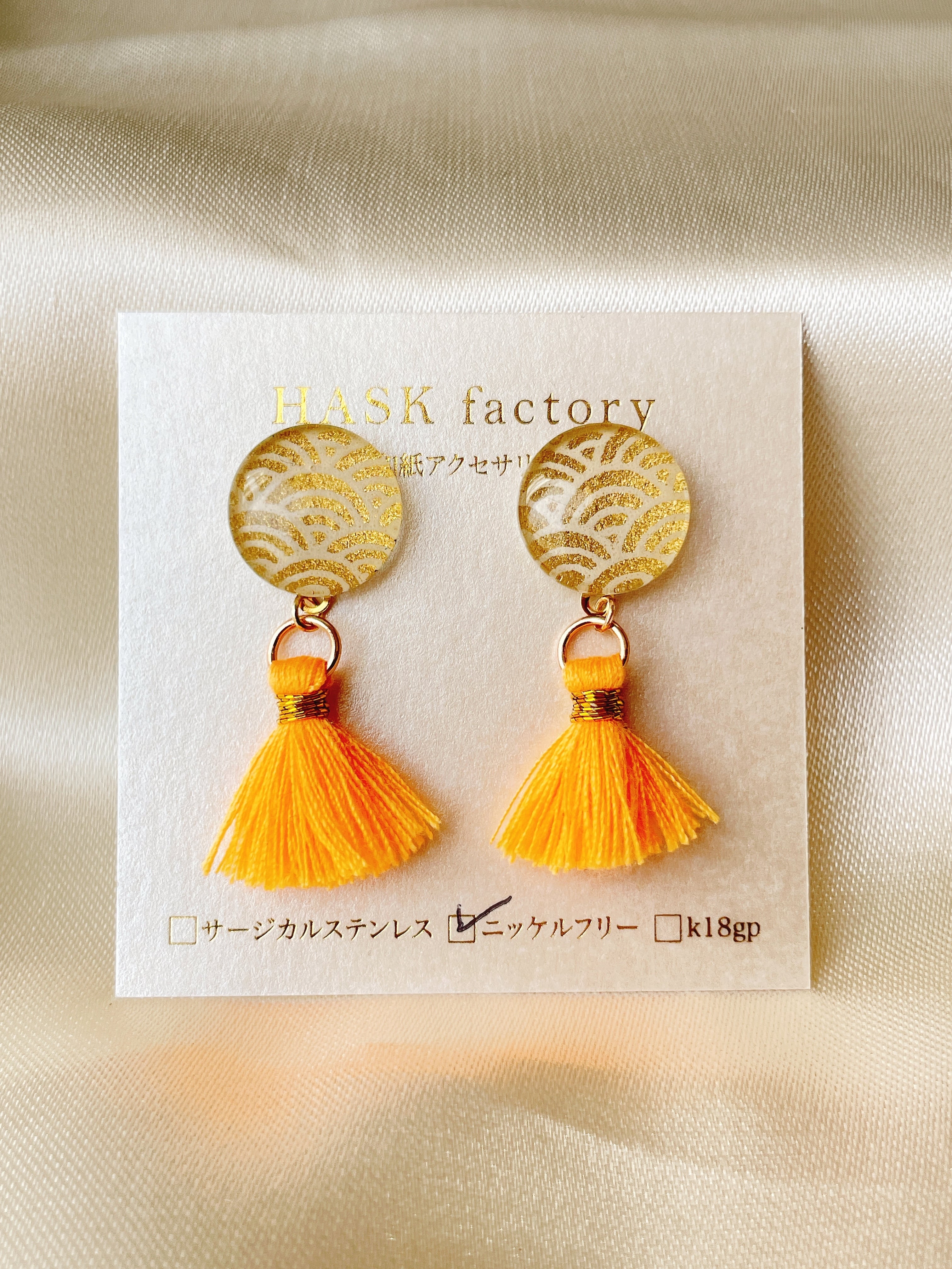 青海波のモチーフが、耳元に上品な輝きを与え、特別な魅力を演出します。オレンジ色のタッセルが揺れる様子はとても華やかで、日常のコーディネートに鮮やかなアクセントを加えてくれるでしょう。