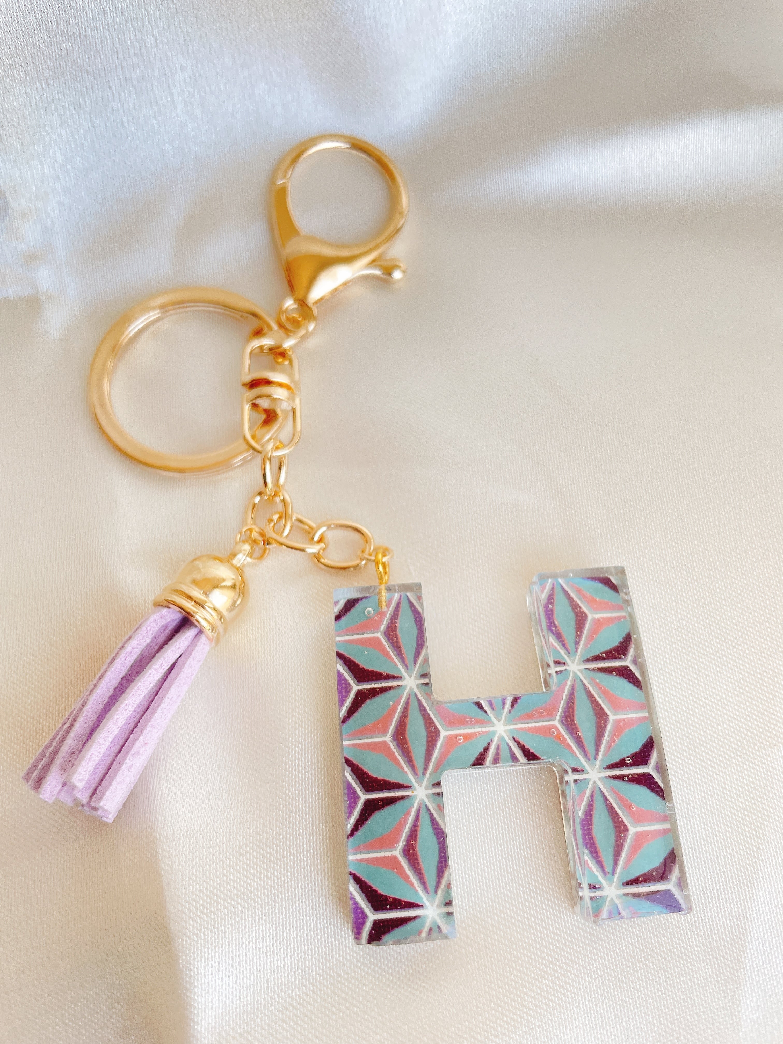 麻の葉柄の和紙を使用した、個性的なイニシャルキーホルダー Hです。