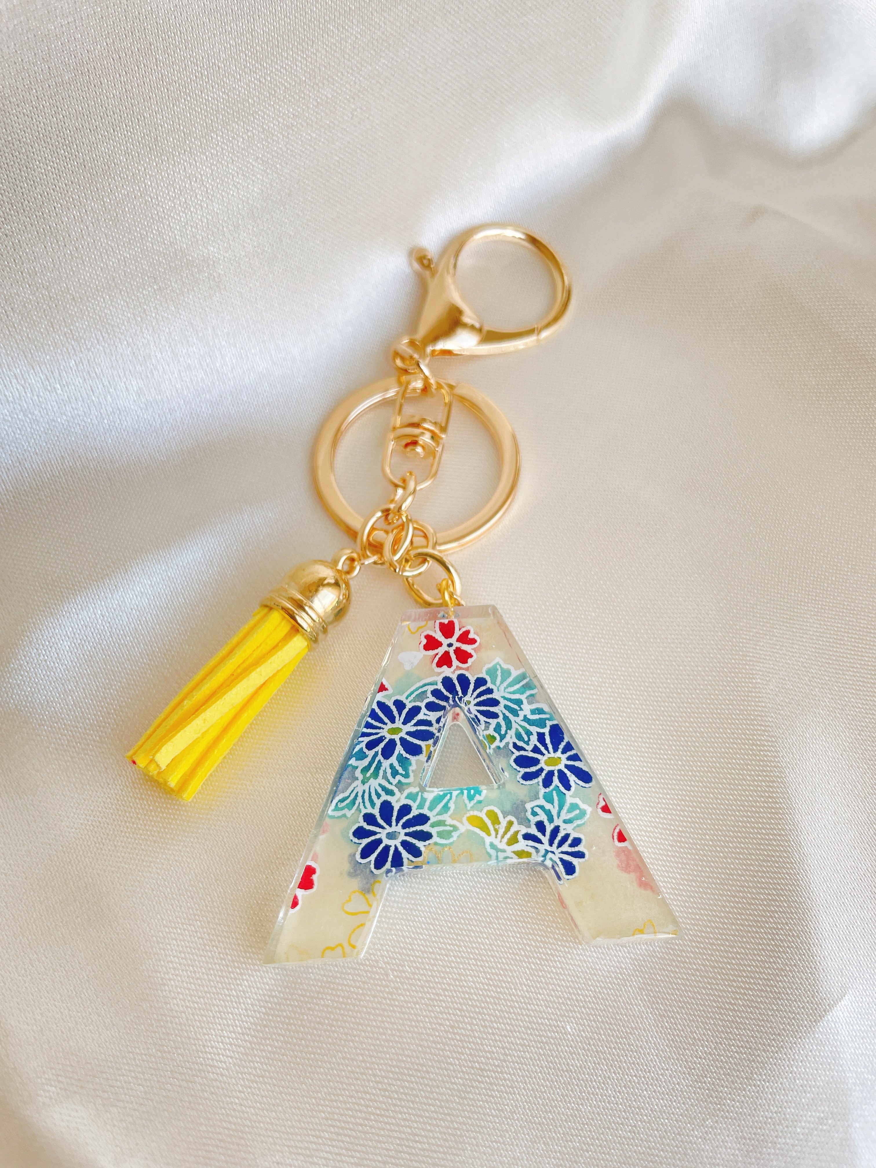 青い花柄の和紙を使用した、魅力的なイニシャルキーホルダー Aです。