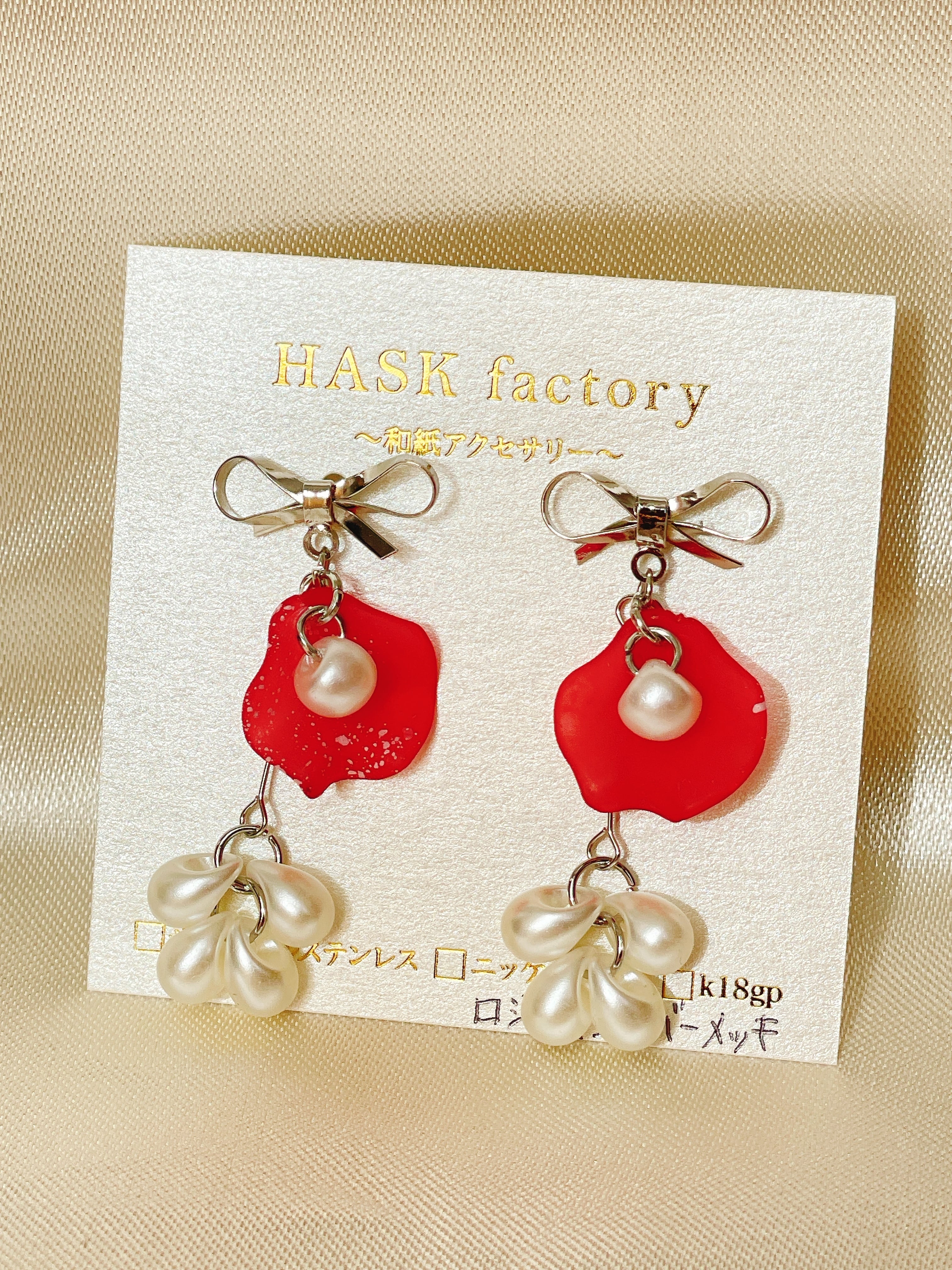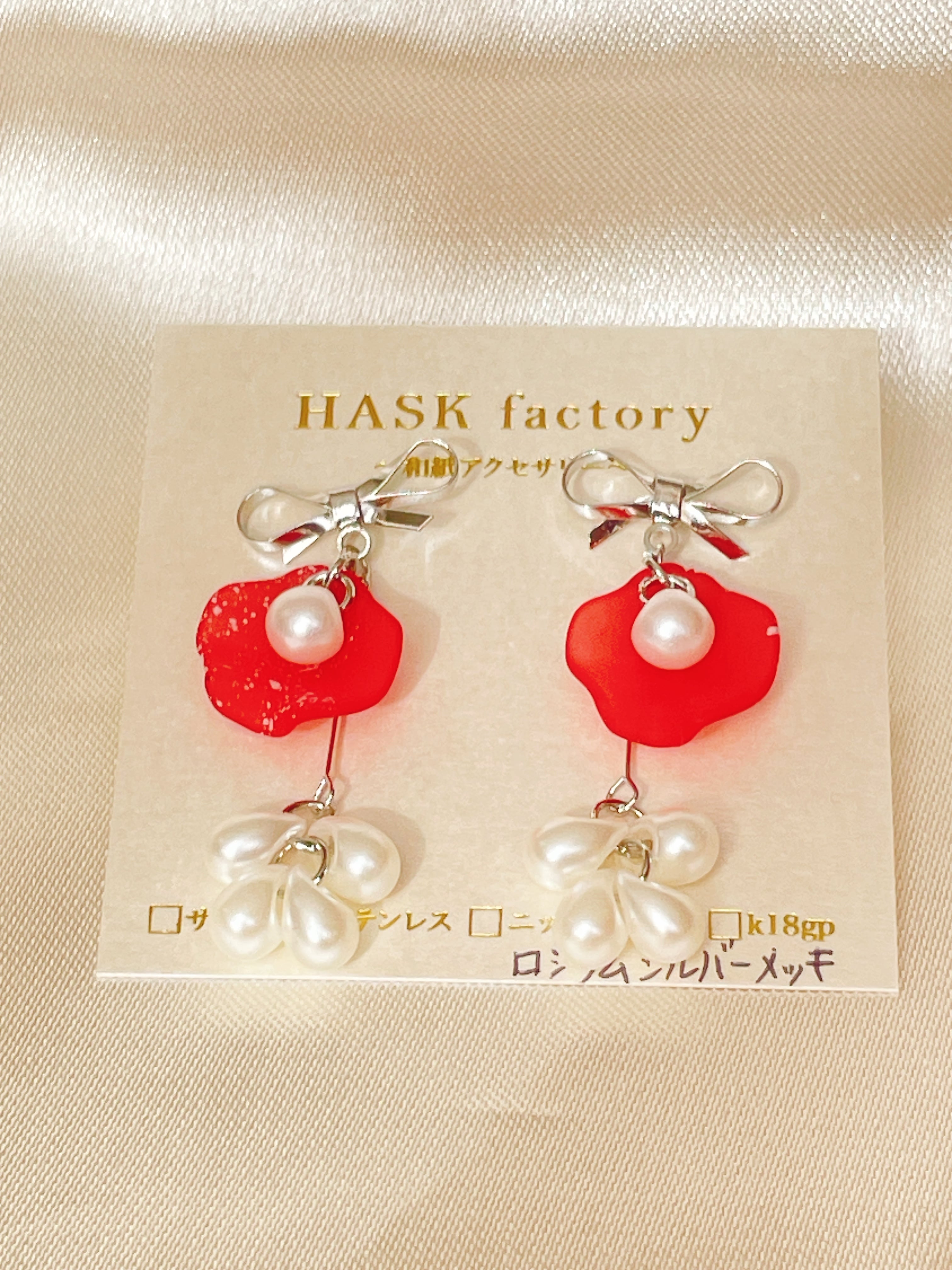 ひとひらの花びらから雫がこぼれ落ちて揺れているような、優雅で愛らしいデザインのピアスです。